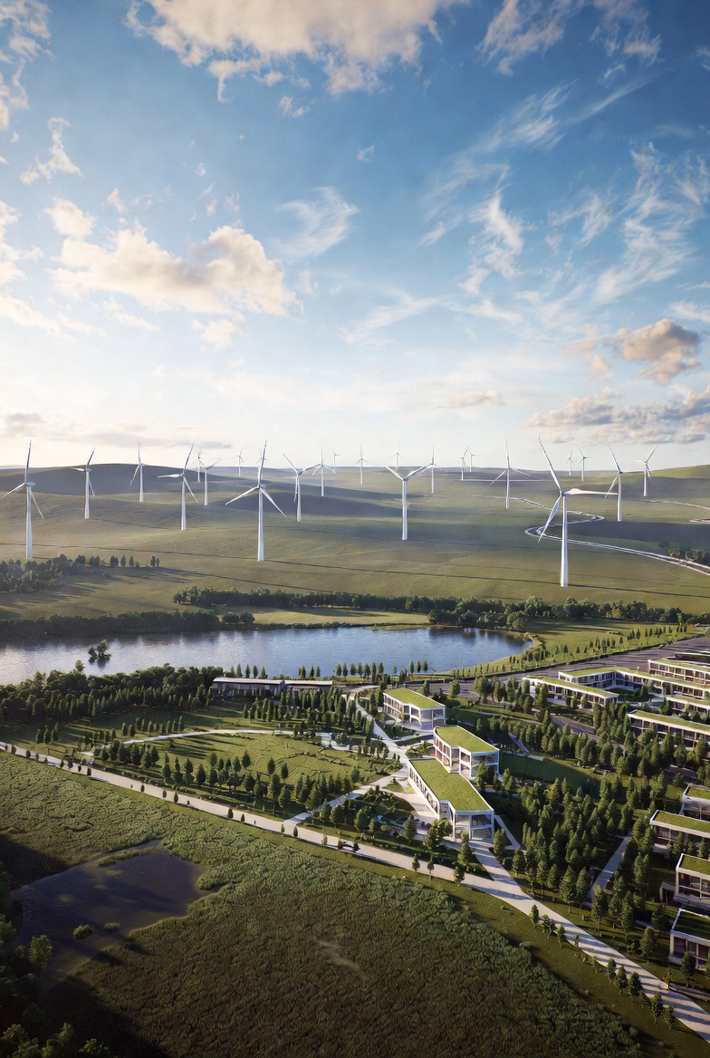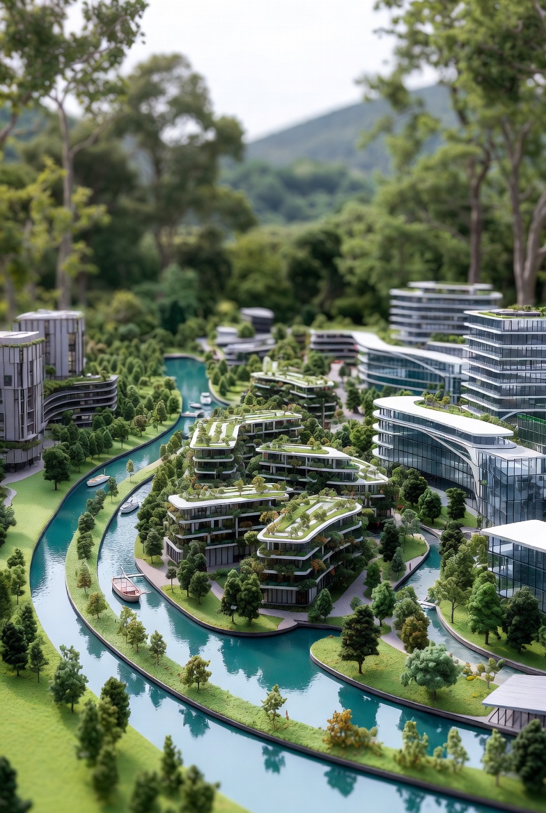 Integrated urban development featuring eco-friendly infrastructure, smart transportation systems, and green residential zones. A blueprint for sustainable urban living in the 21st century.